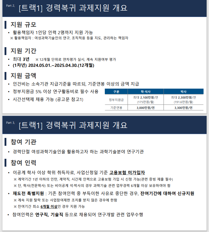 -(트랙1) 경력복귀 과제지원 : 경력이 단절된 여성과학기술인을 신규 채용 시