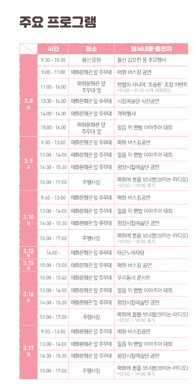 올해로 제23회를 맞는 광양매화축제는 '광양매화, K-문화를 담다'라는 주제와 '매화가 오니, 봄이 피었습니다'를 슬로건 아래 차별화되곻 매력적인 콘텐츠로 방문객을 기다린다고 합니다.